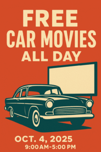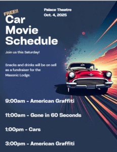 That’s right! We’re playing car movies all day to go with our Oldsmobile Car Show on the downtown square at the Palace Theatre.