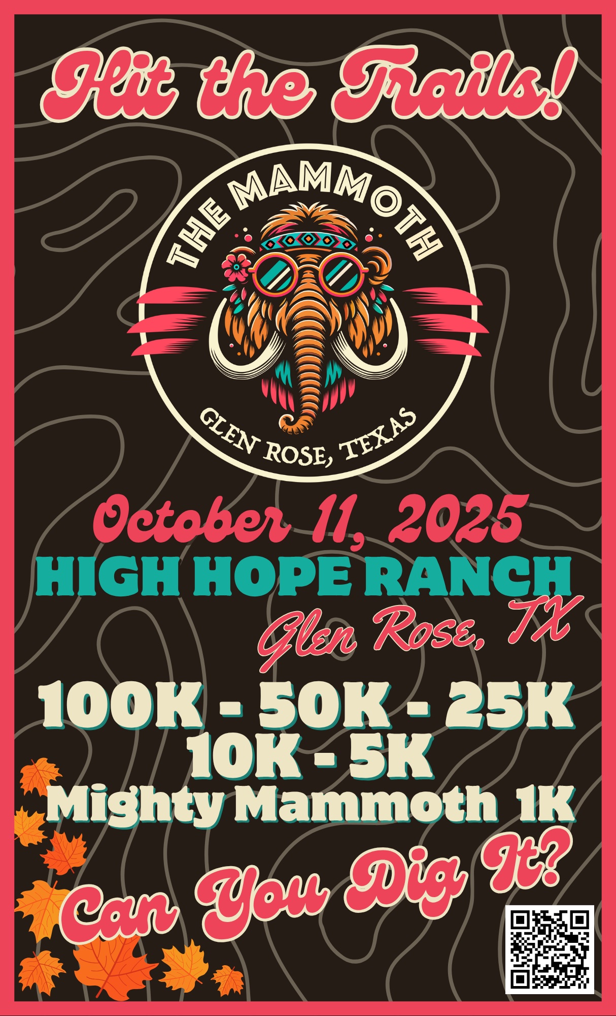 Get ready for The Mammoth Race inaugural Fall Classic at High Hope Ranch! This multi-distance trail run welcomes families and runners of all skill levels. Enjoy the pristine Hill Country that surrounds this stunning ONE THOUSAND acre Eco-Retreat. The ranch is dedicated to wildlife habitat protection, biodynamic agriculture and neighbors Fossil Rim Wildlife Center. This a fantastic way to celebrate the Fall Harvest Season and create some lasting memories! We can’t wait to see you out there!